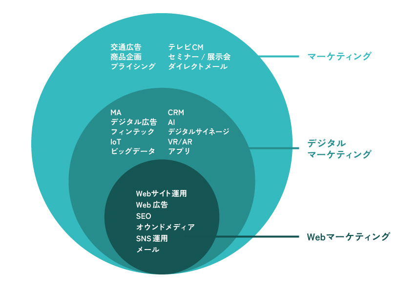 デジタルマーケティングとは、Webサイトだけでなく、スマホアプリ、IoT機器、デジタルサイネージ、さらにはPOSデータなどのあらゆるデジタル技術やデータを活用したマーケティング全般を指す広義の言葉です。つまり、Webマーケティングはデジタルマーケティングという大きな枠組みの中の一部であり、Webサイトを中心にマーケティング活動を行うといえます。