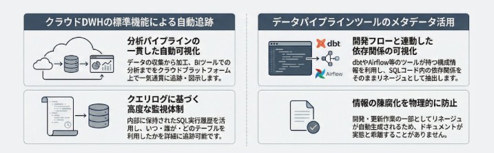 データリネージュの実装において、手作業によるドキュメント作成は、システム変更への追従が困難なため推奨されません。現代のデータ基盤では、既存のツールやクラウド機能を活用した自動的にリネージュが作成されてることが理想となります。