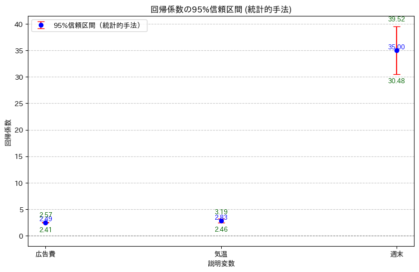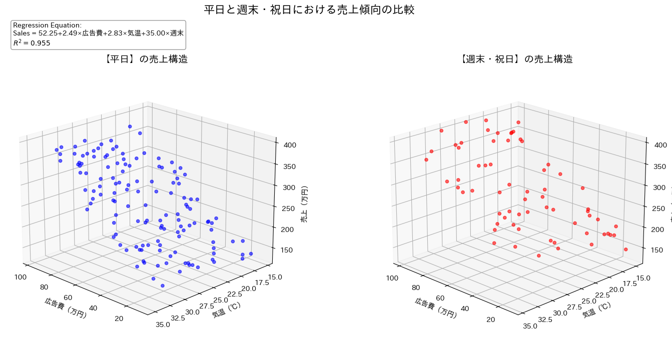 === 重回帰分析の結果 === 切片: 52.25 各変数の係数: 広告費: 2.49 気温: 2.83 週末: 35.00 R² (決定係数): 0.955 回帰式: 売上 = 52.25 + 2.49×広告費 + 2.83×気温 + 35.00×週末 |