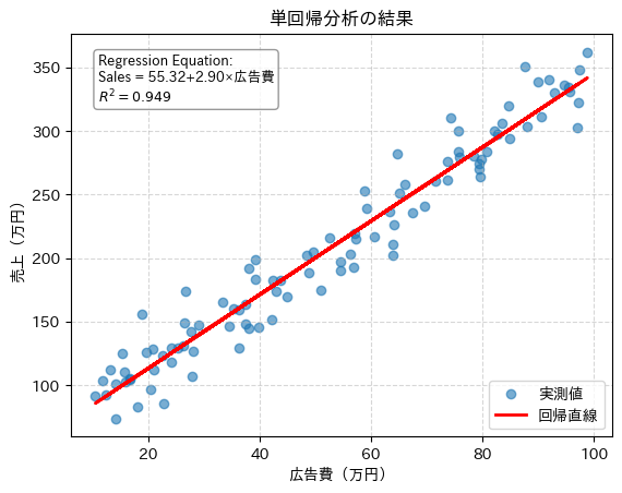 | # 可視化 intercept = model.intercept_ coef = model.coef_[0] r2 = model.score(X, y) # 1. グラフ内に表示するテキストを作成(LaTeX形式を利用) stats_text = (f”Regression Equation:\nSales = {intercept:.2f}+{coef:.2f}×広告費\n”f”$R^2 = {r2:.3f}$”) # 2. 可視化 plt.scatter(df[‘広告費’], df[‘売上’], alpha=0.6, label=’実測値’) plt.plot(df[‘広告費’], model.predict(X), ‘r-‘, linewidth=2, label=’回帰直線’) # 3. グラフ内にテキストを配置 plt.gca().text(0.05, 0.95, stats_text, transform=plt.gca().transAxes, fontsize=9, verticalalignment=’top’, bbox=dict(boxstyle=’round’, facecolor=’white’, alpha=0.8, edgecolor=’gray’)) plt.xlabel(‘広告費(万円)’) plt.ylabel(‘売上(万円)’) plt.title(‘単回帰分析の結果’) plt.legend(loc=’lower right’) plt.grid(True, linestyle=’–‘, alpha=0.5) plt.show() |