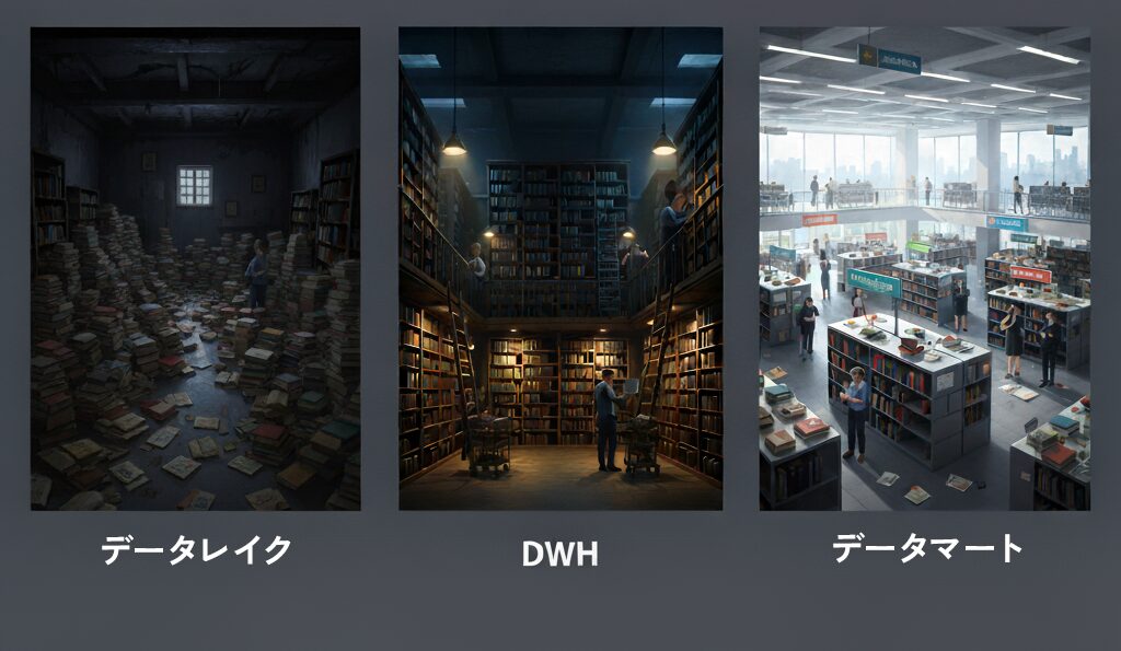 データ分析の世界を、一つの大きな「図書館」に例えて、登場するシステムたちの役割を紹介します。この全体像を掴むことが、DWHの必要性を理解する一番の近道です。